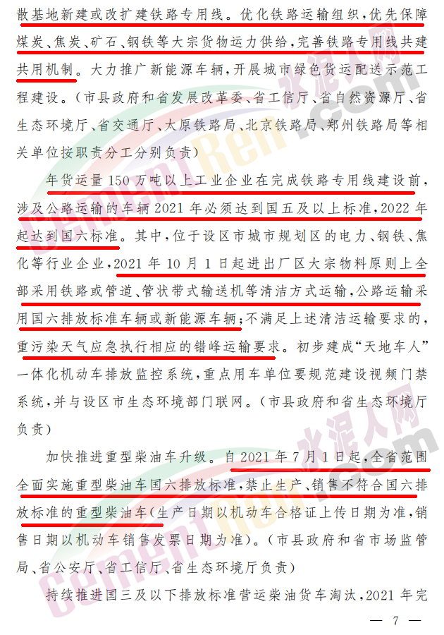 年貨運(yùn)量150萬噸以上工業(yè)企業(yè)在完成鐵路專用線建設(shè)前,涉及公路運(yùn)輸?shù)能囕v2021年必須達(dá)到國五及以上標(biāo)準(zhǔn),2022年起達(dá)到國六標(biāo)準(zhǔn)。其中,位于設(shè)區(qū)市城市規(guī)劃區(qū)的電力、鋼鐵、焦化等行業(yè)企業(yè),2021年10月1日起進(jìn)出廠區(qū)大宗物料原則上全部采用鐵路或管道、管狀帶式輸送機(jī)等清潔方式運(yùn)輸,公路運(yùn)輸采用國六排放標(biāo)準(zhǔn)車輛或新能源車輛;不滿足上述清潔運(yùn)輸要求的,重污染天氣應(yīng)急執(zhí)行相應(yīng)的錯(cuò)峰運(yùn)輸要求。初步建成“天地車人”一體化機(jī)動(dòng)車排放監(jiān)控系統(tǒng),重點(diǎn)用車單位要規(guī)范建設(shè)視頻門禁系統(tǒng),并與設(shè)區(qū)市生態(tài)環(huán)境部門聯(lián)網(wǎng)。加快推進(jìn)重型柴油車升級。