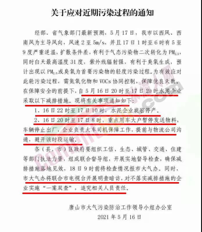 5月16日,唐山市發(fā)布《關(guān)于應(yīng)對(duì)近期污染過程的通知》稱,自5月16 日 20時(shí)至 I7日 20時(shí)水泥企業(yè)采取減排措施。16日22 時(shí)至 17日10時(shí),水泥企業(yè)旋窯停產(chǎn)。16 日20 時(shí)至17日8時(shí),重點(diǎn)用車大戶暫停發(fā)送物料,車輛停止出廠,企業(yè)負(fù)責(zé)大車司機(jī)保障工作,提前與物流公司溝通,避開該時(shí)段運(yùn)輸。