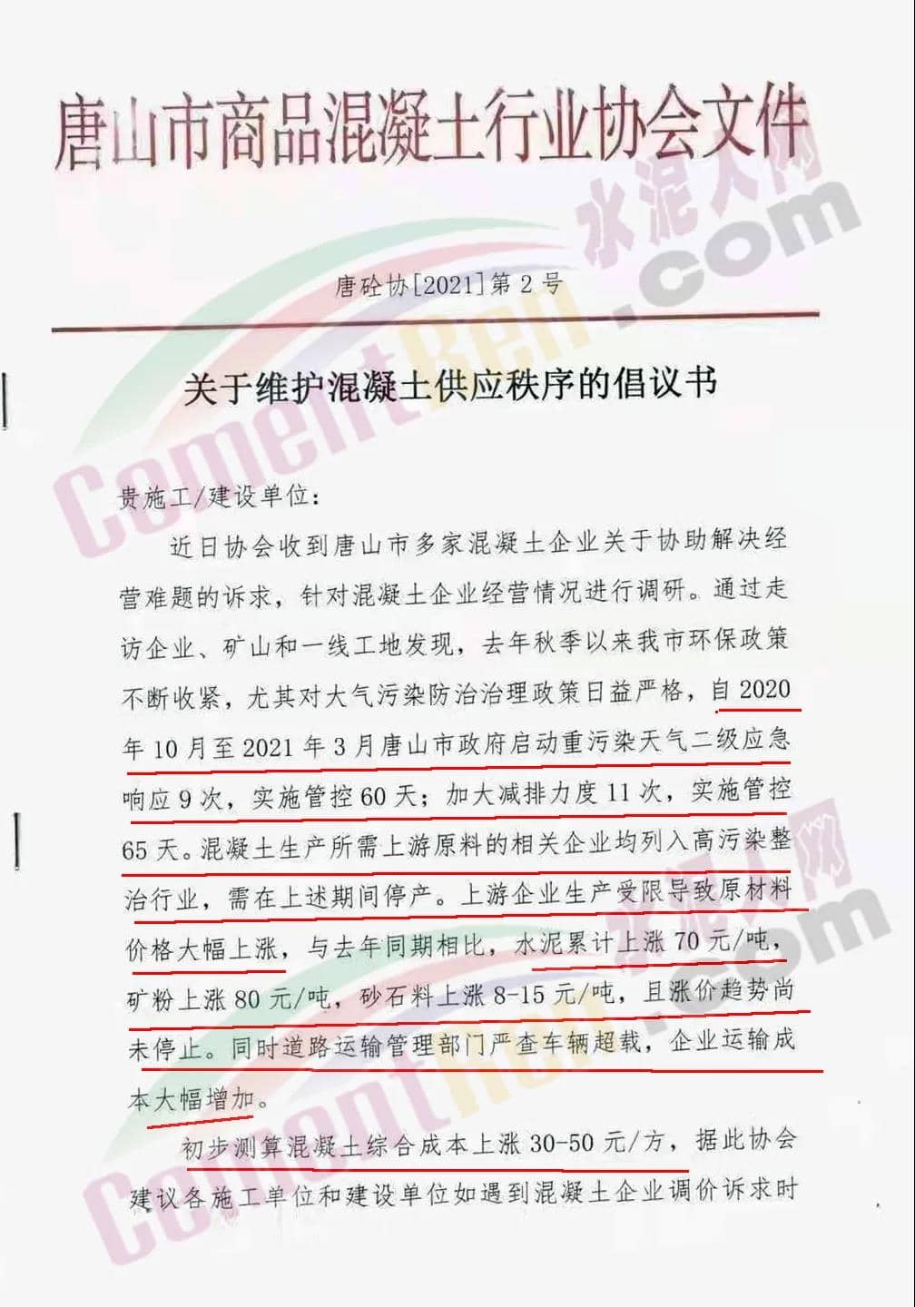 唐山市商品混凝土行業(yè)協(xié)會發(fā)布《關(guān)于維護混凝土供應(yīng)秩序的倡議書》給下游施工建設(shè)單位稱: