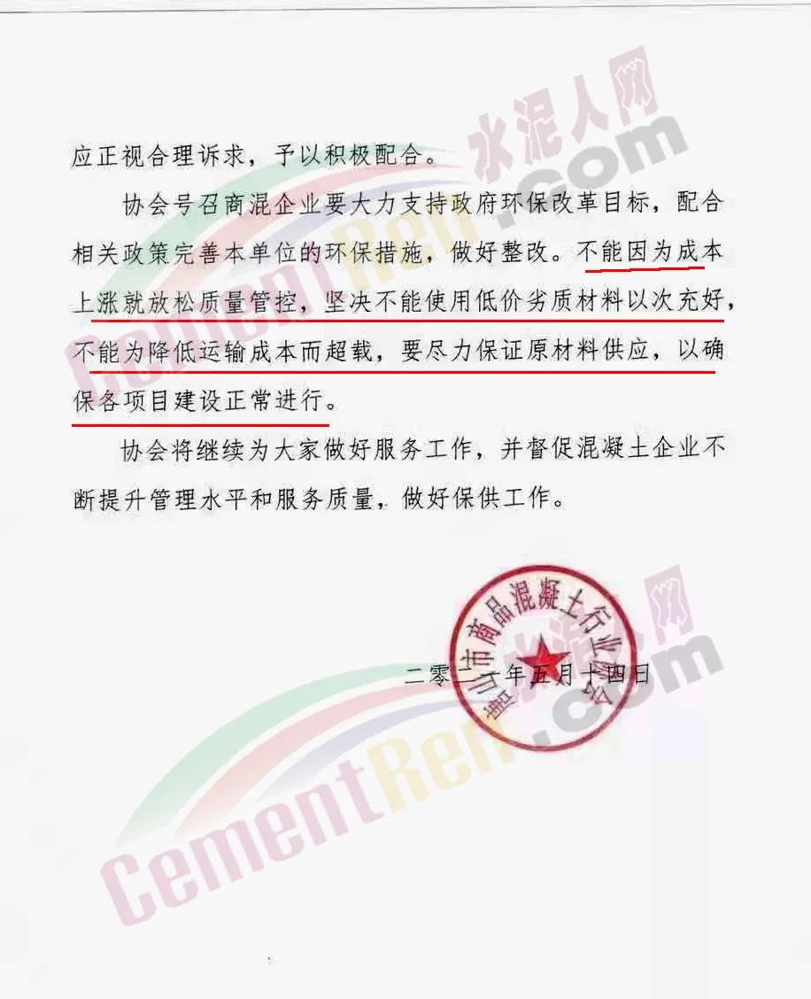 協(xié)會號召商混企業(yè)要大力支持政府環(huán)保改革目標(biāo),配合相關(guān)政策完善本單位的環(huán)保措施,做好整改。不能因為成本上漲就放松質(zhì)量管控,堅決不能使用低價劣質(zhì)材料以次充好,不能為降低運輸成本而超載,要盡力保證原材料供應(yīng),以確保各項目建設(shè)正常進行。