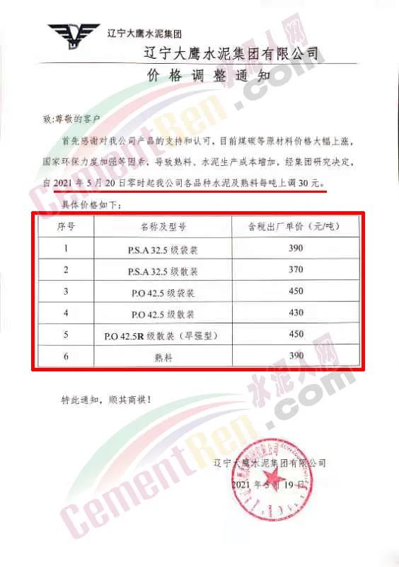 日前,遼寧大鷹通知自5月20日起上調(diào)各標號水泥及熟料價格30元/噸。上調(diào)后PO42.5散裝水泥報價430元/噸,熟料報價390元/噸。