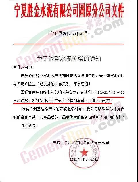 寧夏勝金水泥通知,5月20日起對各品種水泥上調(diào)30元/噸。