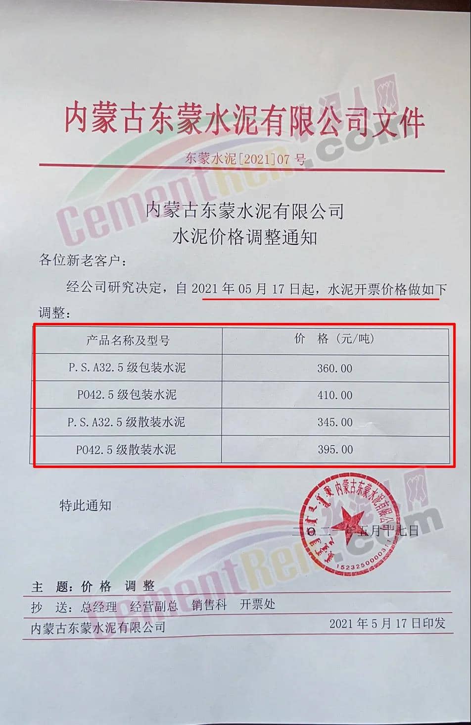 內(nèi)蒙古東蒙水泥有限公司通知自5月17日起執(zhí)行最新報價,其中PO42.5散裝水水泥報價395元/噸。
