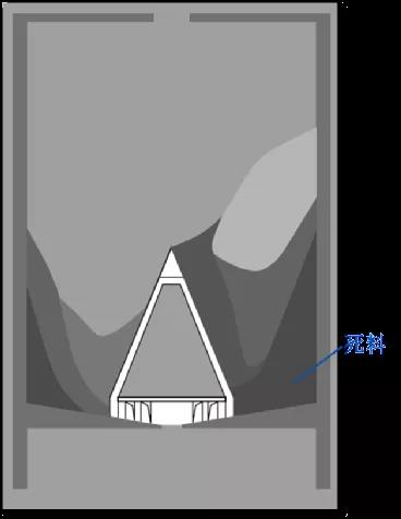 安裝了太極錐后,受料位高度,含氣量及使用情況的影響,料位下降到一定高度后,由于對(duì)應(yīng) F重變小,導(dǎo)致 (F重+F吸)<F拱,就會(huì)形成邊壁部分料流流動(dòng)變慢,而中部軟料繼續(xù)維持整體流,結(jié)構(gòu)變成部分整體流,兩者高差逐步擴(kuò)大,逐步形成尾料。