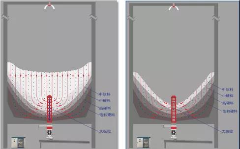 圖5. 較低庫(kù)位出現(xiàn)部分整體流(左)圖6. 徹底放空呈現(xiàn)自然堆積尾料(右)
