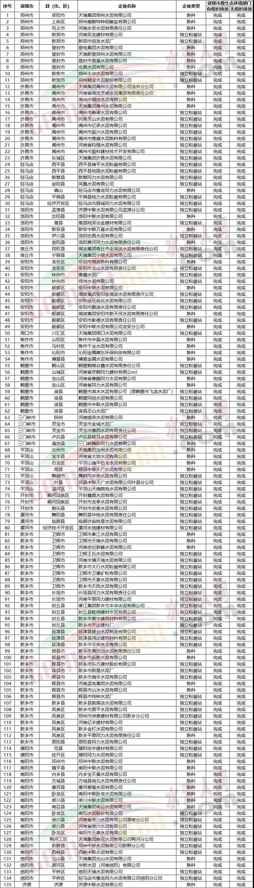 備注:按照《河南省生態(tài)環(huán)保廳關(guān)于進(jìn)一步做好水泥企業(yè)超低排放改造審核工作的通知》要求,水泥企業(yè)經(jīng)省轄市級(jí)生態(tài)環(huán)境管理部門評(píng)估確認(rèn)達(dá)到超低排放要求后,認(rèn)定為完成超低排放改造。