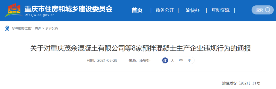 重慶茂余混凝土有限公司、重慶市城投混凝土有限公司、重慶華冠混凝土有限公司、重慶三圣實(shí)業(yè)股份有限公司、重慶首溪建材有限公司、重慶鐵川混凝土工程有限公司、重慶建典混凝土有限公司、重慶遠(yuǎn)立新型建材有限公司等8家預(yù)拌混凝土生產(chǎn)企業(yè)未切實(shí)履行生產(chǎn)質(zhì)量責(zé)任,未按相關(guān)法律、法規(guī)和工程建設(shè)強(qiáng)制性標(biāo)準(zhǔn)開(kāi)展預(yù)拌混凝土質(zhì)量控制工作,予以全市通報(bào)批評(píng),記入不良信用信息六個(gè)月。