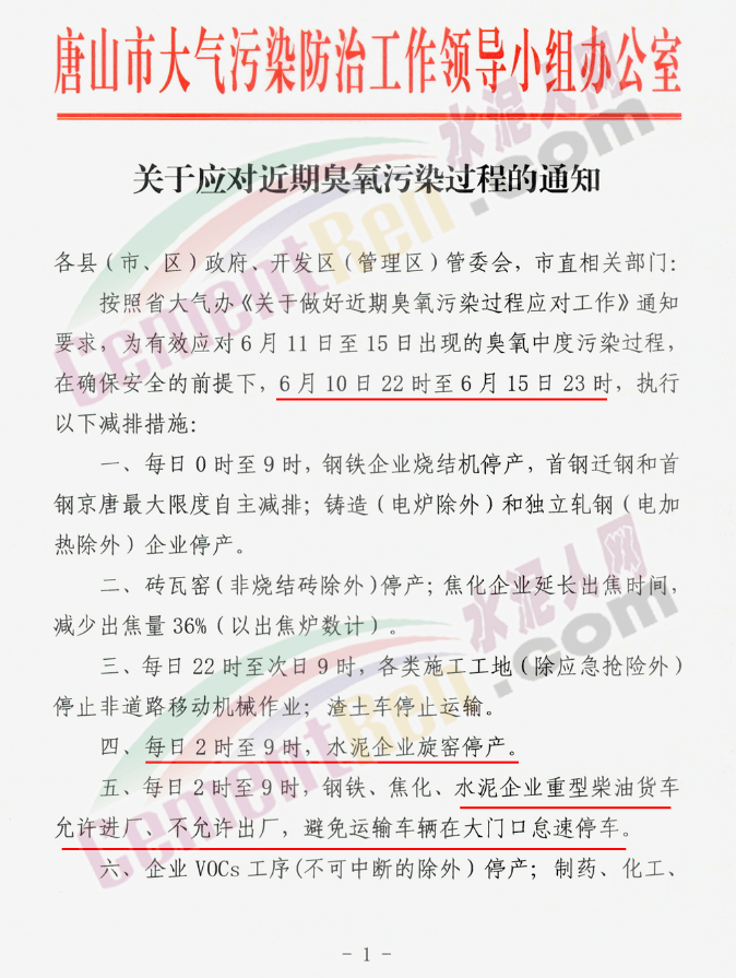 日前,唐山市大氣污染防治工作領(lǐng)導(dǎo)小組辦公室發(fā)布《關(guān)于應(yīng)對(duì)近期臭氧污染過(guò)程的通知》給轄區(qū)各縣(市、區(qū))政府、開(kāi)發(fā)區(qū)(管理區(qū))管委會(huì),市直相關(guān)部門稱,按照省大氣辦《關(guān)于做好近期臭氧污染過(guò)程應(yīng)對(duì)工作》通知要求,為有效應(yīng)對(duì)6月 11日至 15 日出現(xiàn)的臭氧中度污染過(guò)程,在確保安全的前提下,6月10日 22時(shí)至6月15日 23時(shí),每日 2 時(shí)至 9 時(shí),水泥企業(yè)旋窯停產(chǎn);每日 2 時(shí)至 9 時(shí),鋼鐵、焦化、水泥企業(yè)重型柴油貨車允許進(jìn)廠、不允許出廠,避免運(yùn)輸車輛在大門口怠速停車。