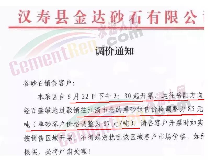 湖南省漢壽縣金達(dá)砂石有限公司發(fā)布調(diào)價(jià)通知,自6月22日下午2:30起開(kāi)票,運(yùn)往岳陽(yáng)方向經(jīng)百盛錨地過(guò)駁銷往江浙市場(chǎng)的黑砂銷售價(jià)格調(diào)整為85元/噸(單砂客戶價(jià)格調(diào)整為87元/噸)。
