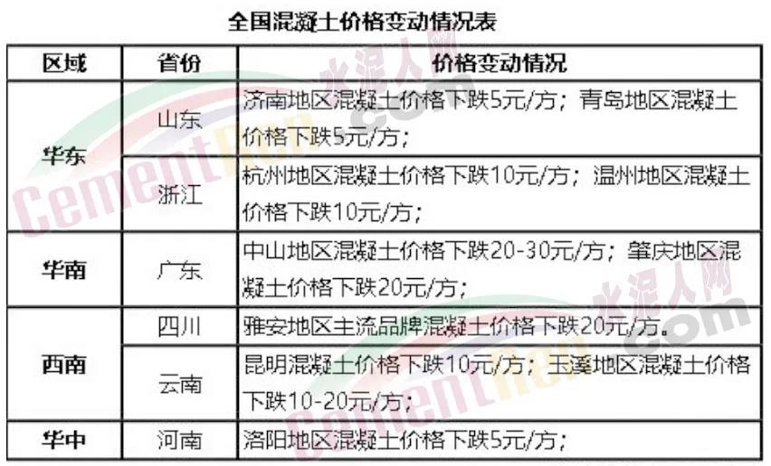 混凝土價(jià)格方面,上周全國(guó)混凝土價(jià)格繼續(xù)下跌,華東區(qū)域原材行情弱勢(shì),價(jià)格小幅下跌;華南區(qū)域原材下跌,混凝土價(jià)格下行;華北區(qū)域市場(chǎng)需求疲軟,價(jià)格穩(wěn)中偏弱運(yùn)行;華中區(qū)域成本降低,混凝土價(jià)格持穩(wěn)運(yùn)行;西南區(qū)域原材料價(jià)格下行,商混價(jià)格小幅下跌;東北區(qū)域原材價(jià)格上漲,價(jià)格偏強(qiáng)運(yùn)行;西北區(qū)域原材價(jià)格回落,市場(chǎng)價(jià)格暫穩(wěn)。