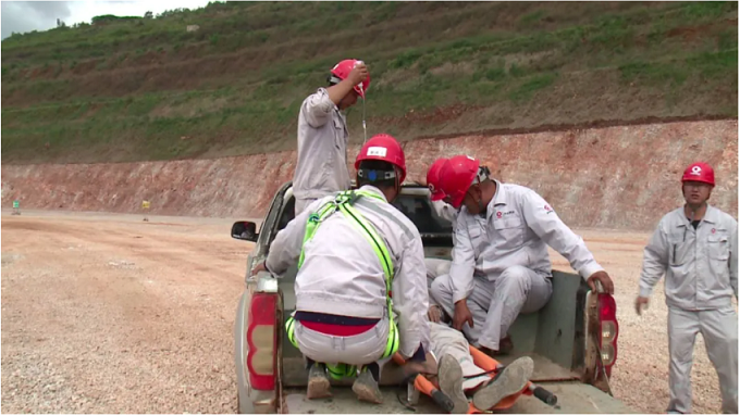 事故模擬礦山2327-2339平臺(tái)進(jìn)行爆破作業(yè)后,爆破員楊某和袁某準(zhǔn)備對(duì)爆堆進(jìn)行爆后安全檢查,兩人一前一后走向爆堆,就在此時(shí),楊某所在平臺(tái)區(qū)域突然發(fā)生溶洞坍塌,由于事發(fā)突然躲避不及,楊某隨塌陷區(qū)域掉入溶洞,右腳被壓無(wú)法移動(dòng),右腳小腿有出血現(xiàn)象,由于出血量多,傷員逐漸進(jìn)入昏迷狀態(tài),需迅速救治。見此狀況,袁某認(rèn)真查看了現(xiàn)場(chǎng)情況,對(duì)傷者楊某簡(jiǎn)單安慰后立即將事故現(xiàn)場(chǎng)情況報(bào)告給值班領(lǐng)導(dǎo)。公司調(diào)度員和值班領(lǐng)導(dǎo)接到報(bào)告后,立即啟動(dòng)《礦山溶洞坍塌事故應(yīng)急救援預(yù)案》,并按各自職責(zé)組織相關(guān)人員,成立臨時(shí)應(yīng)急救援小組,趕赴事發(fā)現(xiàn)場(chǎng),進(jìn)行應(yīng)急救援處置。救援小組人員到達(dá)現(xiàn)場(chǎng)后,警戒小組立即在坍塌區(qū)域范圍內(nèi)進(jìn)行警戒,禁止人員、設(shè)備靠近。由現(xiàn)場(chǎng)指揮組織技術(shù)人員對(duì)溶洞進(jìn)行勘察、評(píng)估,擬定救援方案。同時(shí)參加救援的應(yīng)急救援組、醫(yī)療救護(hù)組、善后保障組根據(jù)救援方案,立即展開救援。整個(gè)演練過(guò)程,各參演小組聽從指揮,統(tǒng)一行動(dòng),快速反應(yīng),分工協(xié)作,順利完成了緊急疏散、信息報(bào)告、現(xiàn)場(chǎng)警戒、現(xiàn)場(chǎng)搶險(xiǎn)救援、醫(yī)療急救、檢測(cè)保障等工作,直至應(yīng)急響應(yīng)終止,達(dá)到了應(yīng)急演練的預(yù)期目的。