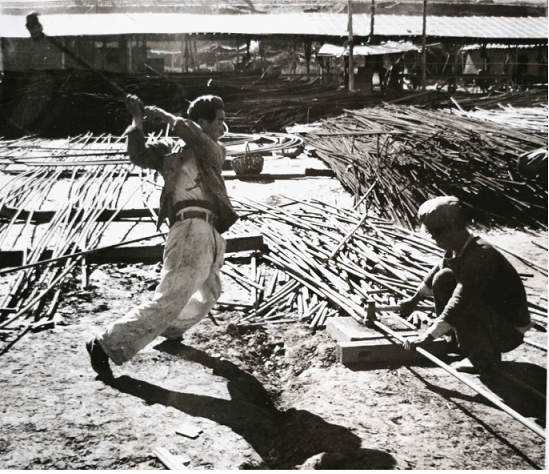 照片中的主人公傅德成是熱火朝天地參與永登水泥廠建設(shè)的一員,從白山黑水的東北來到莽莽蒼蒼的西北,他全神貫注地盯著目標(biāo),踮起腳尖,腰身前弓,張開雙臂,掄起20多磅重的大錘,鉚足全身的力氣,準(zhǔn)備軋斷25#圓鋼。不遠(yuǎn)處,已經(jīng)有一堆軋好的圓鋼靜靜等待著被搬去施工……