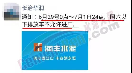長(zhǎng)治華潤(rùn)水泥通知,6月29日0時(shí)至7月1日24時(shí),國(guó)六以下排放車不允許進(jìn)廠。