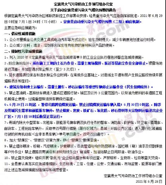 山西省忻州市定襄縣通知2021年6月29日0時(shí)至7月1日24時(shí)(72小時(shí)),山西省忻州市定襄縣啟動(dòng)重污染天氣橙色預(yù)警(二級(jí))響應(yīng)機(jī)制。要求所有施工工地的土石方作業(yè)、混凝土現(xiàn)場(chǎng)攪拌、拆遷等易起塵作業(yè)全部停止。建筑垃圾和渣土運(yùn)輸車、混凝土罐車、砂石運(yùn)輸車等重型車輛停止運(yùn)輸作業(yè)。