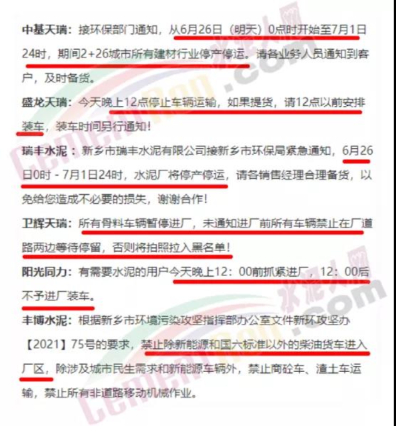 要求自2021年6月26日0時(shí)至7月1日24時(shí)新鄉(xiāng)市全域范圍內(nèi)包括水泥及水泥制品在內(nèi)的所有建材企業(yè)停產(chǎn);生產(chǎn)調(diào)控企業(yè)同步錯(cuò)峰運(yùn)輸,禁止除新能源和國(guó)六標(biāo)準(zhǔn)以外的中重型貨車進(jìn)出廠區(qū),禁止商砼車、渣土車運(yùn)輸,禁止非道路移動(dòng)機(jī)械作業(yè);礦山、砂石料廠、石板材廠等停止露天作業(yè)。應(yīng)通知要求河南新鄉(xiāng)多家企業(yè)通知暫停裝車。