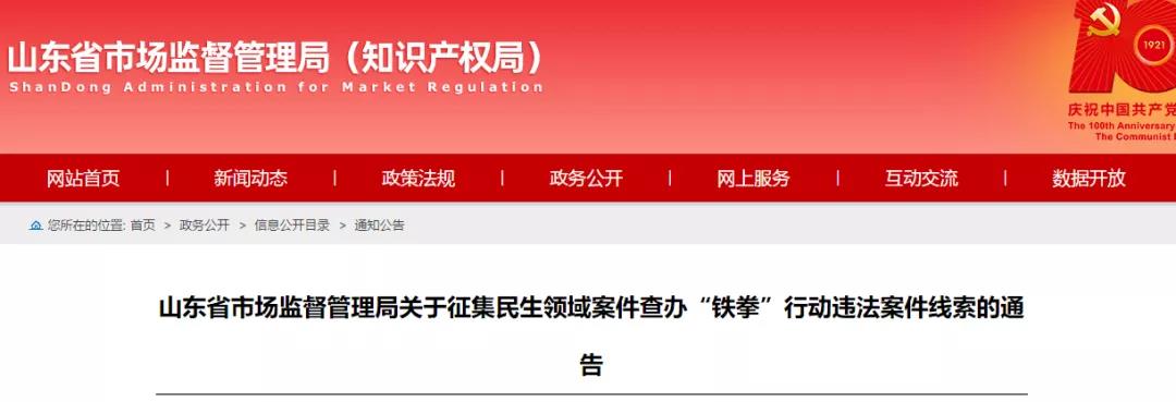 根據(jù)國(guó)家市場(chǎng)監(jiān)管總局統(tǒng)一部署,山東省市場(chǎng)監(jiān)督管理局在全省開展民生領(lǐng)域案件查辦“鐵拳”行動(dòng),“鐵拳”行動(dòng)堅(jiān)持問題導(dǎo)向、目標(biāo)導(dǎo)向,聚焦關(guān)系人民群眾生命健康安全的重點(diǎn)商品、重點(diǎn)行業(yè)、重點(diǎn)區(qū)域,重點(diǎn)打擊10類民生領(lǐng)域違法行為?,F(xiàn)面向社會(huì)發(fā)布通告,公開征集下列10類違法案件線索:
