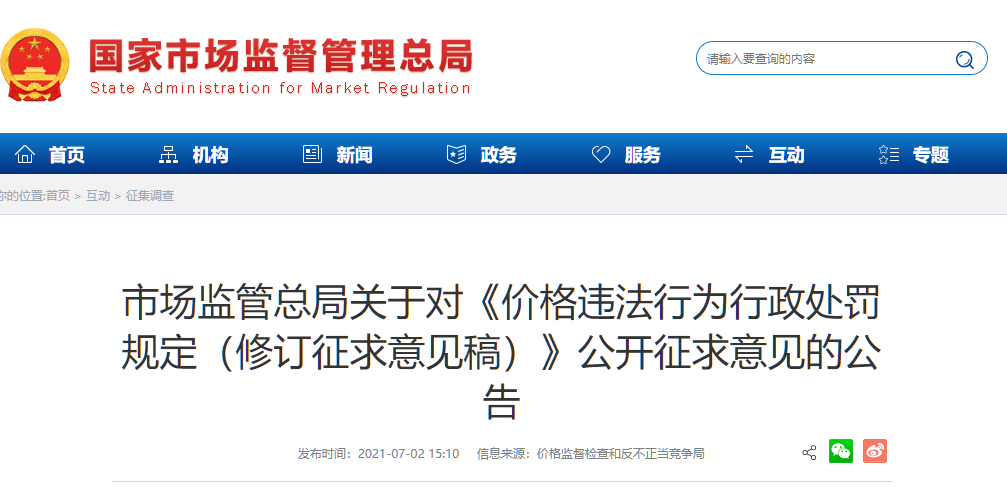7月2日,市場監(jiān)管總局發(fā)布《關(guān)于對<價格違法行為行政處罰規(guī)定(修訂征求意見稿)>公開征求意見的公告》稱為貫徹落實1月20日國常會部署,加快修訂價格違法行為行政處罰等方面法規(guī),及時修改或廢除不合理的行政處罰事項,更大激發(fā)市場主體活力,市場監(jiān)管總局起草了《價格違法行為行政處罰規(guī)定(修訂征求意見稿)》,現(xiàn)向社會公開征求意見。歡迎各有關(guān)單位和個人提出意見和建議,并于2021年8月2日前反饋市場監(jiān)管總局。