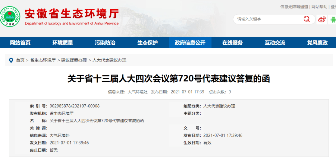 日前,安徽省生態(tài)環(huán)境廳官網(wǎng)發(fā)布《關(guān)于省十三屆人大四次會(huì)議第720號(hào)代表建議答復(fù)的函》稱,韓先云代表在省十三屆人大四次會(huì)議期間提出的《關(guān)于進(jìn)一步加強(qiáng)大氣污染防治的建議》收悉,經(jīng)研究辦理,并給予答復(fù)。