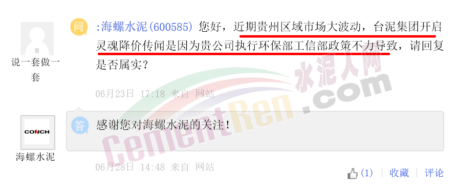 有投資者在上證e互動平臺向海螺水泥提問稱,近期貴州區(qū)域市場出現(xiàn)較大波動,臺泥集團開啟靈魂降價,傳聞是因為海螺水泥執(zhí)行環(huán)保部工信部政策不力導致,請回復是否屬實?海螺水泥上市公司回復“感謝您對海螺水泥的關(guān)注”。