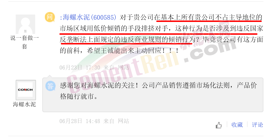 另有投資者提問,對于海螺公司在不占主導地位的市場區(qū)域用低價傾銷的手段排擠對手,這種行為是否涉及到違反國家反壟斷法上面規(guī)定的違反商業(yè)規(guī)則的傾銷行為?海螺水泥回復稱,公司產(chǎn)品銷售遵循市場化法則,產(chǎn)品價格隨行就市。
