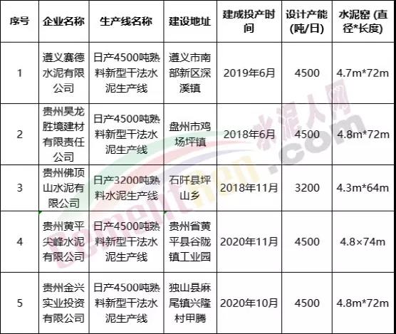 據(jù)貴州省工信廳此前公布的截止2020年底的熟料生產(chǎn)線清單來看,有四條4500t/d和一條3200t/d熟料生產(chǎn)線是在2018年至2020年內(nèi)新投產(chǎn)的。