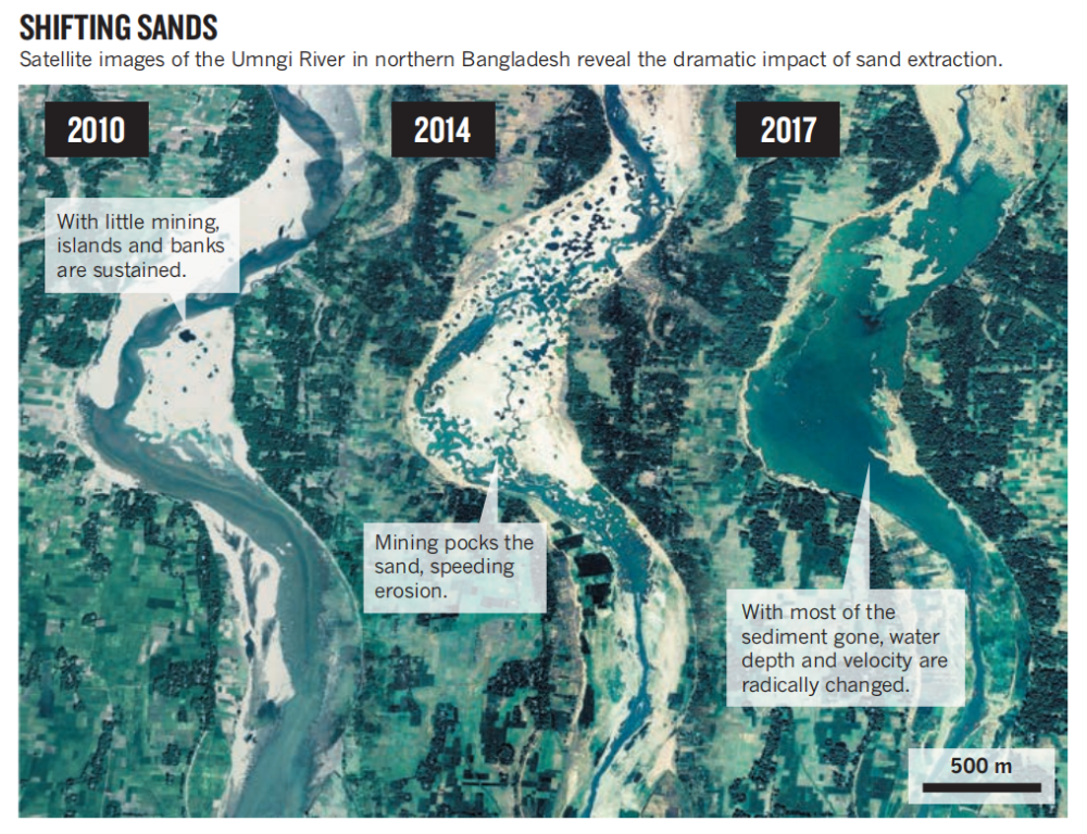 孟加拉國北部烏姆吉河的衛(wèi)星圖像顯示了采砂的巨大影響