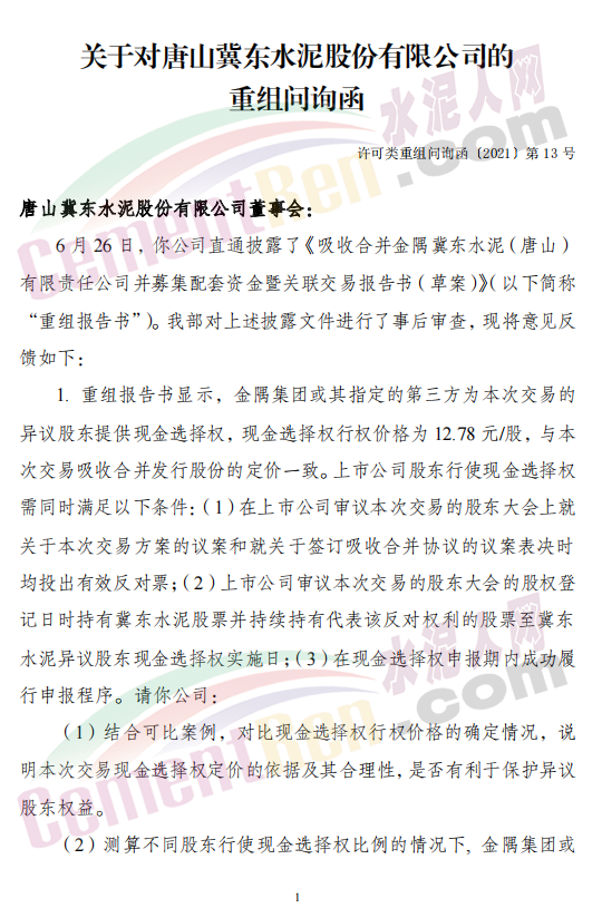 7月6日,冀東水泥上市公司收到深交所上市公司管理一部發(fā)來(lái)的《關(guān)于對(duì)唐山冀東水泥股份有限公司的重組問(wèn)詢函》(以下簡(jiǎn)稱“問(wèn)詢函”)。問(wèn)詢函提到6月26日,冀東水泥上市公司披露了《吸收合并金隅冀東水泥(唐山)有限責(zé)任公司并募集配套資金暨關(guān)聯(lián)交易報(bào)告書(shū)(草案)》。深交所要求公司結(jié)合可比案例,對(duì)比現(xiàn)金選擇權(quán)行權(quán)價(jià)格的確定情況,說(shuō)明本次交易現(xiàn)金選擇權(quán)定價(jià)的依據(jù)及其合理性,是否有利于保護(hù)異議股東權(quán)益;測(cè)算不同股東行使現(xiàn)金選擇權(quán)比例的情況下,金隅集團(tuán)或其指定的第三方需支付的現(xiàn)金及其履約能力,及冀東水泥公司在本次交易前后股權(quán)結(jié)構(gòu)變化情況。