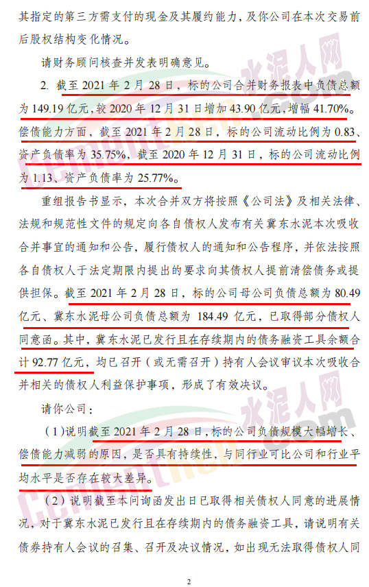 重組報(bào)告書(shū)顯示,本次合并雙方將按照《公司法》及相關(guān)法律、法規(guī)和規(guī)范性文件的規(guī)定向各自債權(quán)人發(fā)布有關(guān)冀東水泥本次吸收合并事宜的通知和公告,履行債權(quán)人的通知和公告程序,并依法按照各自債權(quán)人于法定期限內(nèi)提出的要求向其債權(quán)人提前清償債務(wù)或提供擔(dān)保。截至2021年2月28日,標(biāo)的公司母公司負(fù)債總額為80.49億元、冀東水泥母公司負(fù)債總額為184.49億元,已取得部分債權(quán)人同意函。其中,冀東水泥已發(fā)行且在存續(xù)期內(nèi)的債務(wù)融資工具余額合計(jì)92.77億元,均已召開(kāi)(或無(wú)需召開(kāi))持有人會(huì)議審議本次吸收合并相關(guān)的債權(quán)人利益保護(hù)事項(xiàng),形成了有效決議。請(qǐng)公司: