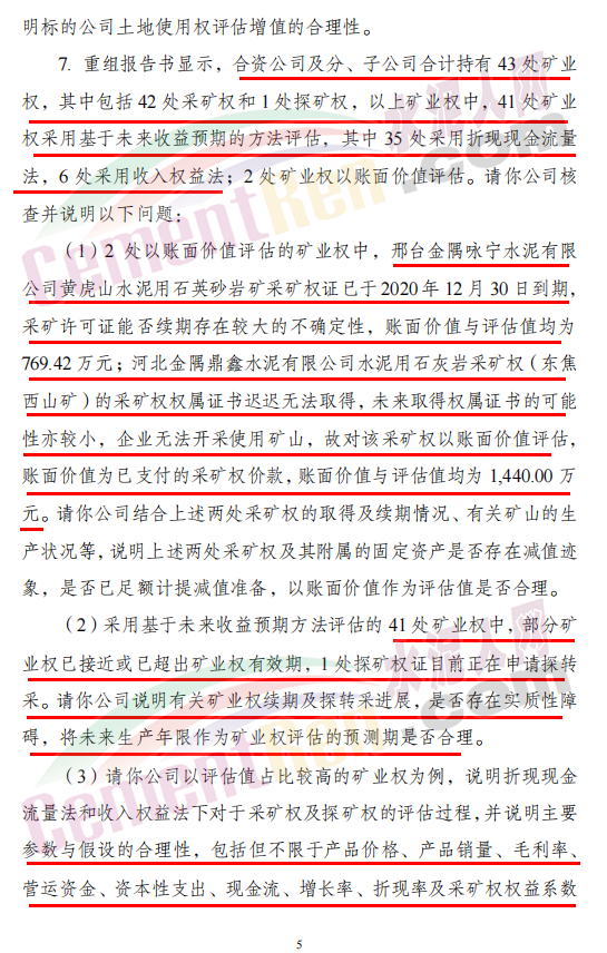 (1)兩處以賬面價(jià)值評(píng)估的礦業(yè)權(quán)中,邢臺(tái)金隅詠寧水泥有限公司黃虎山水泥用石英砂巖礦采礦權(quán)證已于2020年12月30日到期,采礦許可證能否續(xù)期存在較大的不確定性,賬面價(jià)值與評(píng)估值均為769.42萬(wàn)元;河北金隅鼎鑫水泥有限公司水泥用石灰?guī)r采礦權(quán)(東焦西山礦)的采礦權(quán)權(quán)屬證書(shū)遲遲無(wú)法取得,未來(lái)取得權(quán)屬證書(shū)的可能性亦較小,企業(yè)無(wú)法開(kāi)采使用礦山,故對(duì)該采礦權(quán)以賬面價(jià)值評(píng)估,賬面價(jià)值為已支付的采礦權(quán)價(jià)款,賬面價(jià)值與評(píng)估值均為1,440.00萬(wàn)元。