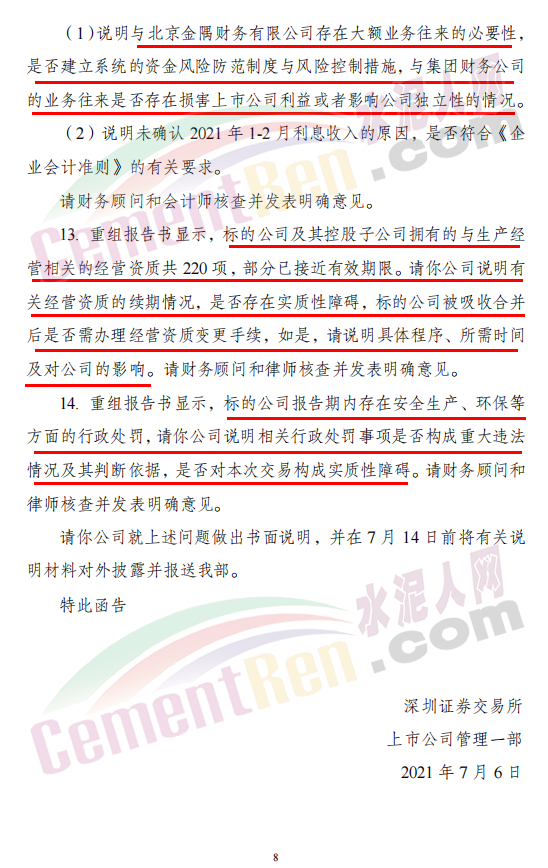 請(qǐng)公司就上述問(wèn)題做出書(shū)面說(shuō)明,并在7月14日前將有關(guān)說(shuō)明材料對(duì)外披露并報(bào)送深交所上市公司管理一部。《關(guān)于對(duì)唐山冀東水泥股份有限公司的重組問(wèn)詢函》全文如下: