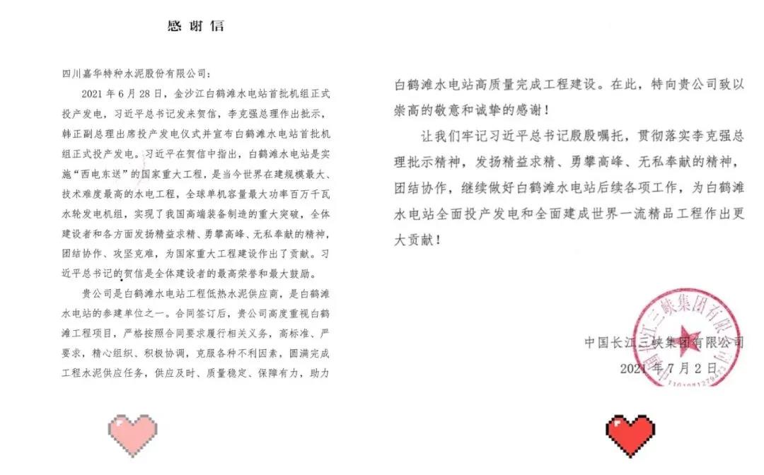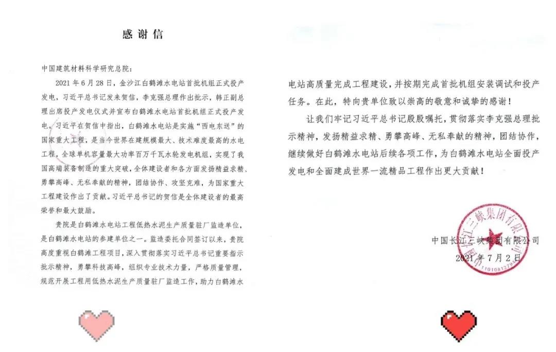 7月5日,中國(guó)建材集團(tuán)所屬中國(guó)建筑材料科學(xué)研究總院有限公司(以下簡(jiǎn)稱“中國(guó)建材總院”)和嘉華特種水泥股份有限公司(以下簡(jiǎn)稱“嘉華水泥”),分別收到了來自白鶴灘水電站開發(fā)建設(shè)方中國(guó)長(zhǎng)江三峽集團(tuán)有限公司的感謝信。