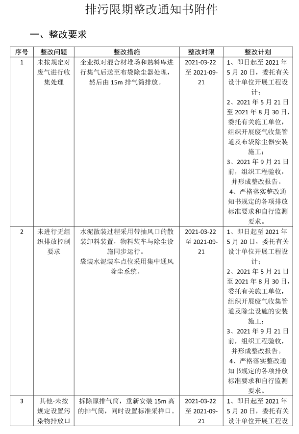 其中,今年3月30日下達(dá)限期整改的廣東清遠(yuǎn)英德市翔發(fā)旋窯水泥有限責(zé)任公司整改問題為“未按規(guī)定對廢氣進(jìn)行收集處理、未進(jìn)行無組織排放控制要求、其他-未按規(guī)定設(shè)置污染物排放口、未完成自主驗收手續(xù)”等。企業(yè)整改措施、整改計劃如下: