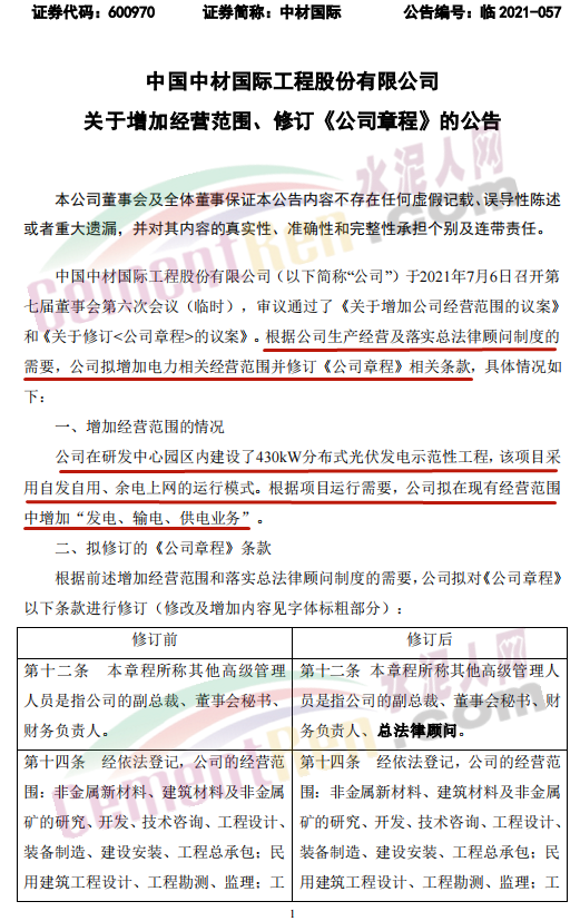 7月6日,中國中材國際工程股份有限公司發(fā)布《關(guān)于增加經(jīng)營范圍、修訂公司<章程>的公告》稱,公司擬增加電力相關(guān)經(jīng)營范圍并修訂《公司章程》相關(guān)條款。具體情況為: