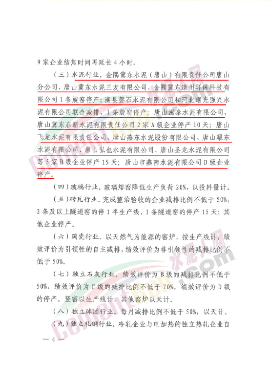 唐山泓泰水泥有限公司、唐山冀東啟新水泥有限責(zé)任公司2家A級企業(yè)停產(chǎn)10天;