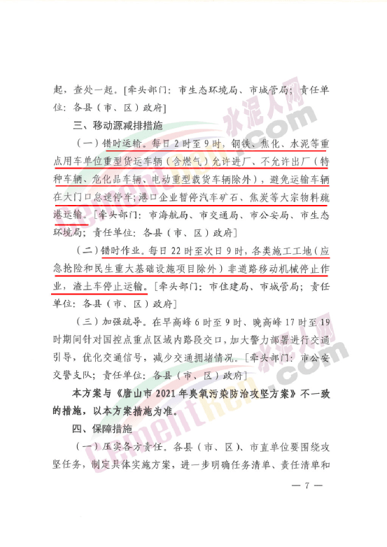 移動源減排措施要求錯時運輸、錯時作業(yè)。每日2時至9時,鋼鐵、焦化、水泥等重點用車單位重型貨運車輛允許進廠、不允許出廠,避免運輸車輛在大門口怠速停車;港口企業(yè)暫停汽車礦石、焦炭等大宗物料疏港運輸;每日22時至次日9時,各類施工工地非道路移動機械停止作業(yè),渣土車停止運輸。