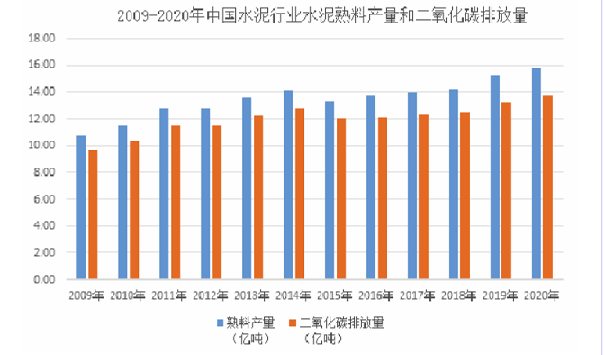 十多年來,水泥熟料產(chǎn)量逐年遞增,中國水泥行業(yè)碳排放從9.71億噸逐步達(dá)到13.75億噸,水泥行業(yè)的碳排放量占全國碳排放總量約13.5%。隨著我國水泥行業(yè)資源、能源利用化水平的提高,節(jié)能降耗先進(jìn)技術(shù)的應(yīng)用,嚴(yán)禁新增產(chǎn)能、產(chǎn)能減量置換、兼并聯(lián)合重組和常態(tài)化錯(cuò)峰生產(chǎn)等有效的鞏固去產(chǎn)能政策的推行,利用環(huán)保、質(zhì)量、能源、技術(shù)、安全等綜合標(biāo)準(zhǔn)推動(dòng)落后產(chǎn)能淘汰,水泥行業(yè)在“十三五”向“十四五”過渡期間碳排放有逐漸達(dá)到峰值的趨勢(shì)。