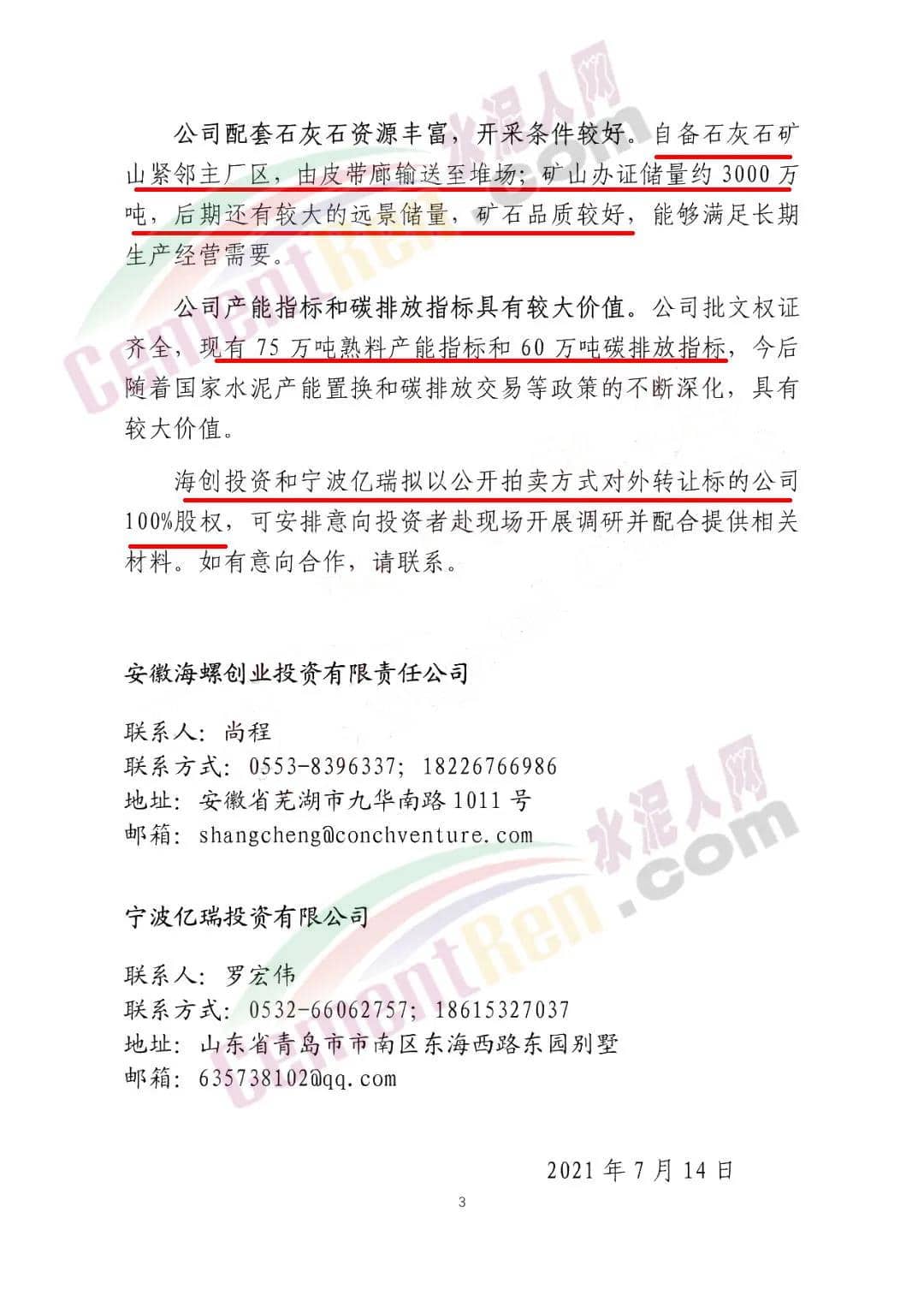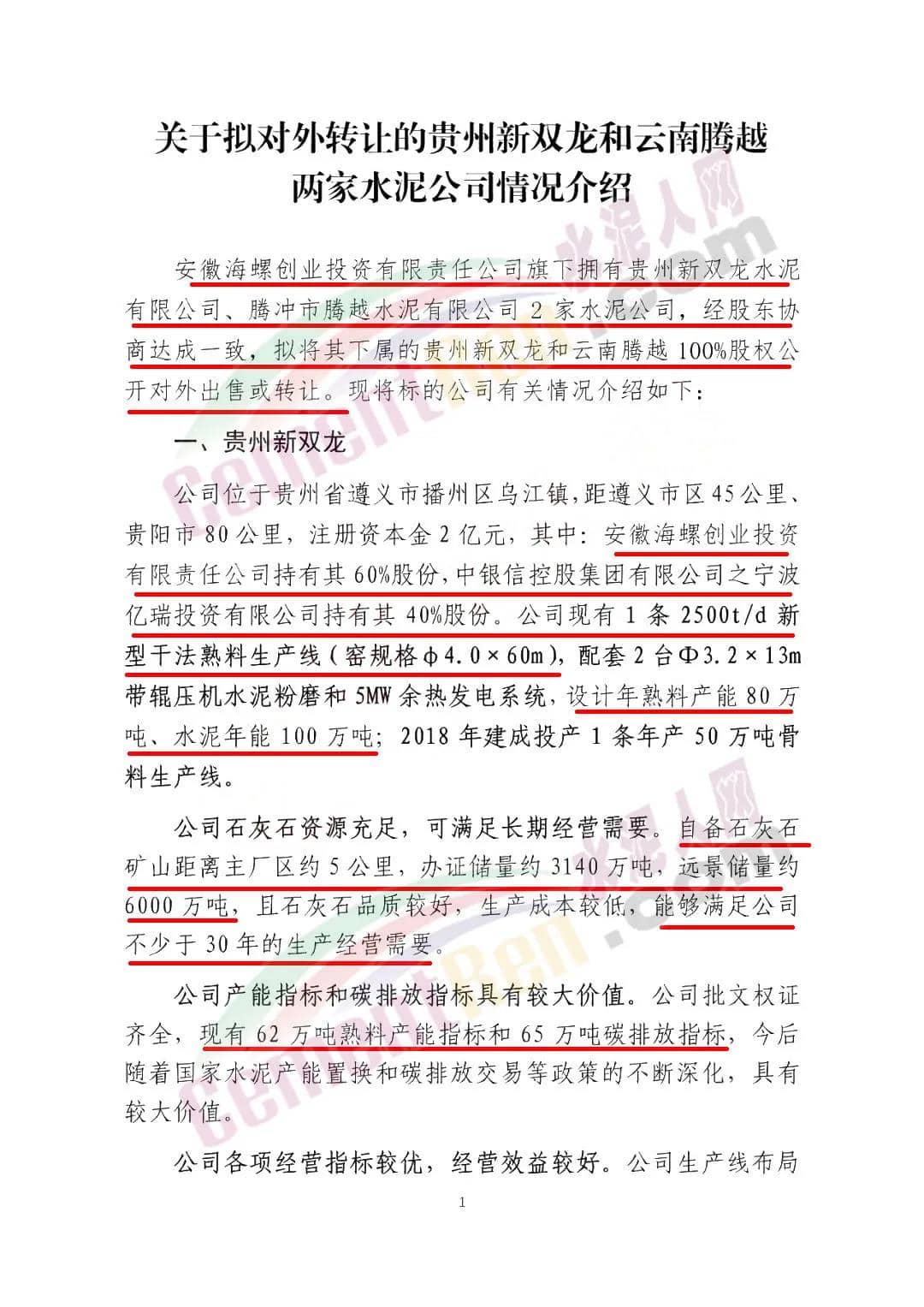 《情況介紹》提到安徽海螺創(chuàng)業(yè)投資有限責(zé)任公司旗下?lián)碛匈F州新雙龍水泥有限公司、騰沖市騰越水泥有限公司2家水泥公司,經(jīng)股東協(xié)商達(dá)成一致,擬將其下屬的貴州新雙龍和云南騰越100%股權(quán)公開對外出售或轉(zhuǎn)讓。
