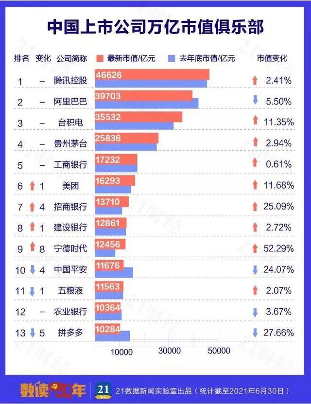 日前,21數(shù)據(jù)新聞實驗室發(fā)布統(tǒng)計數(shù)據(jù),截止2021年6月30日,中國市值500強公司合計總市值達98.78萬億,較年初增長約6%,貢獻了所有中國公司市值的66.48%。其中千億市值公司254家,13家公司市值超萬億元,騰訊控股、阿里巴巴、臺積電穩(wěn)居前三。