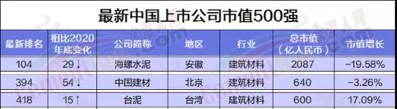 水泥人網(wǎng)注意到作為建材材料排名第一的企業(yè)海螺水泥排名第104位,相比2020年底下降了29位,市值2087億人民幣,較上年末降19.58%。
