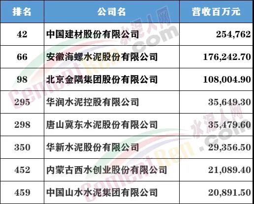 今年上榜公司的年營收門檻接近174億元。受到新冠疫情影響,今年的上榜公司年收入門檻相比去年近178億元的門檻降低了2.3%。去年中國GDP突破100萬億元,今年榜上500家上市公司的收入總和達53萬億元,超過了中國當(dāng)年GDP的一半。其中中國建材股份有限公司、安徽海螺水泥股份有限公司、北京金隅集團股份有限公司、華潤水泥控股有限公司、唐山冀東水泥股份有限公司、華新水泥股份有限公司、內(nèi)蒙古西水創(chuàng)業(yè)股份有限公司、中國山水水泥集團有限公司等8家水泥行業(yè)上市企業(yè)上榜。