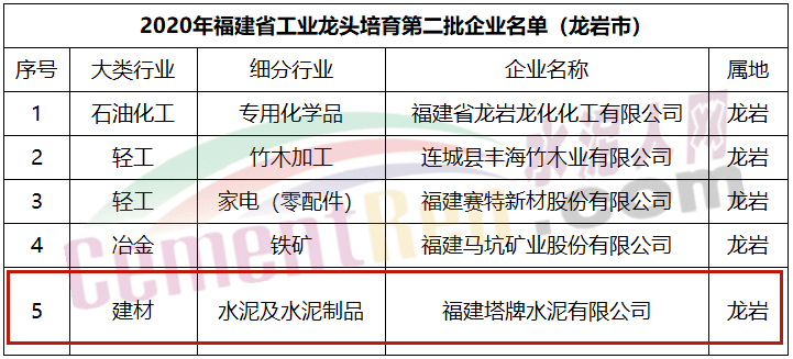 日前,福建省工信廳發(fā)布了《關于發(fā)布福建省工業(yè)龍頭企業(yè)名單(第二批)的通知》,《通知》稱,武平縣的福建塔牌水泥有限公司被認定為2021年福建省工業(yè)龍頭培育企業(yè),為龍巖市5家企業(yè)之一。具體《通知》如下: