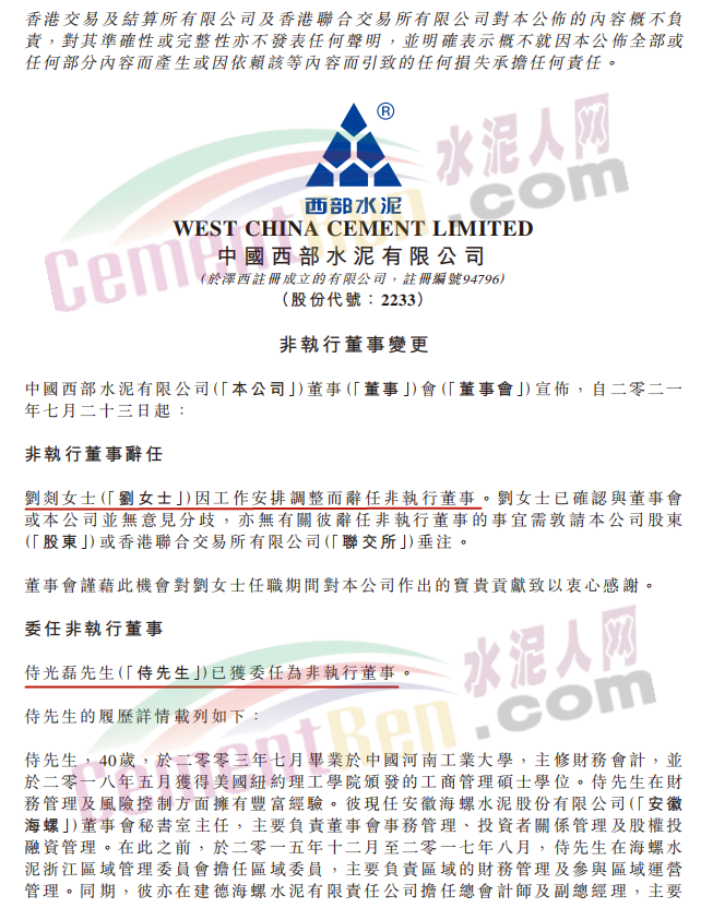 7月23日,西部水泥(02233)發(fā)布《非執(zhí)行董事變更公告》,《公告》稱(chēng),自2021年7月23日起:劉剡因工作安排調(diào)整而辭任非執(zhí)行董事。侍光磊已獲委任為非執(zhí)行董事。具體公告如下: