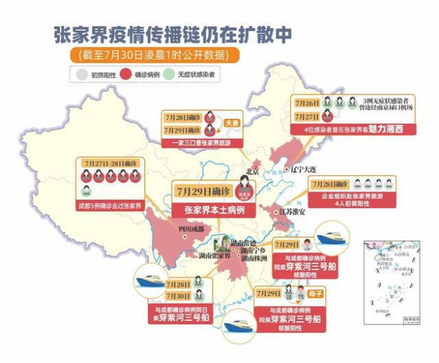 在7月31日國務院聯(lián)防聯(lián)控機制新聞發(fā)布會上,中國疾控中心研究員馮子健提到,這次疫情是先經南京祿口機場輸入并引起了進一步的傳播,多個省份都有病例和感染者傳入。初步判斷,張家界的首發(fā)病例也與南京祿口機場的疫情相關,傳至湖南張家界的病例或者感染者又經旅游景點和大型演出活動感染了其他人,導致了進一步傳播,使近期除南京以外感染和傳播人數較多的重點疫點。