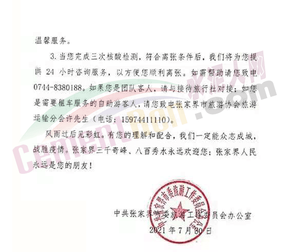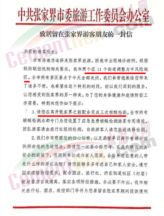 7月30日,湖南省張家界發(fā)布《致居留在張家界游客朋友的一封信》,稱根據聯(lián)防聯(lián)控機制相關要求,張家界兩個區(qū)11個街道調整為中風險地區(qū)。全市所有景區(qū)景點于今天全部關閉,提示游客在離開張家界之前配合完成三次核酸檢測。