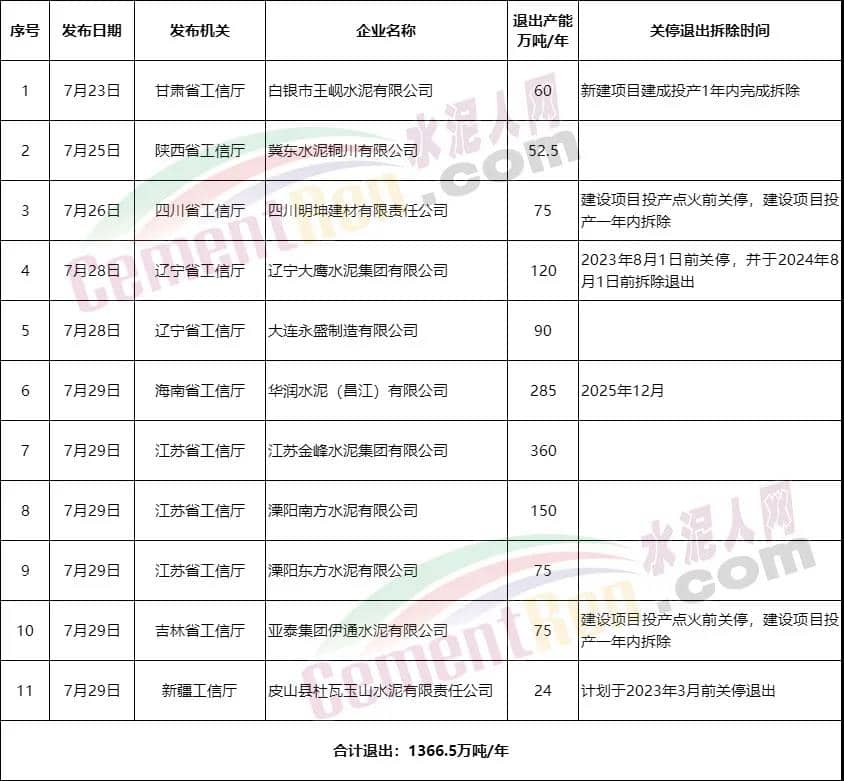 為趕上產(chǎn)能置換“紅利”的末班車,從7月23日至7月29日,甘肅、陜西、四川、遼寧、江蘇、吉林、海南、新疆等多省、自治區(qū)工信部門集中發(fā)布水泥熟料生產(chǎn)線拆除退出以及新建生產(chǎn)線置換公示、公告消息。