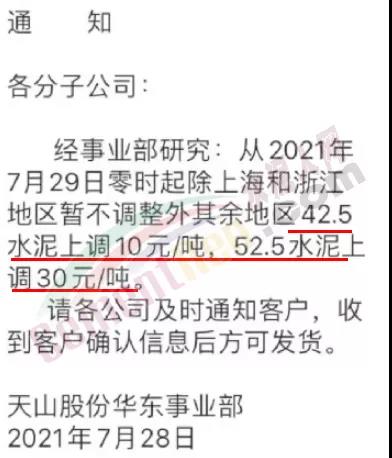 天山水泥股份公司發(fā)通知給各分子公司要求從7月29日零時(shí)起除上海和浙江地區(qū)暫不調(diào)整外其余地區(qū)42.5水泥上調(diào)10元/噸,52.5水泥上調(diào)30元/噸。