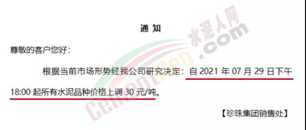 珍珠集團(tuán)銷(xiāo)售處通知自7月29日下午18:00起所有水泥品種價(jià)格上調(diào)30元/噸。