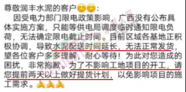 日前,華潤(rùn)水泥通知,因受電力部門(mén)限電政策影響,廣西沒(méi)有公布具體實(shí)施方案,只能等供電局調(diào)度臨時(shí)通知限電負(fù)荷,無(wú)法確定限電截止時(shí)間。目前區(qū)域各基地正積極協(xié)調(diào),導(dǎo)致水泥配送時(shí)間延長(zhǎng),無(wú)法正常發(fā)貨,望各位客戶多多理解,耐心等待。為了不影響工地項(xiàng)目的開(kāi)工,請(qǐng)您提前兩天以上做好提貨計(jì)劃,以免影響項(xiàng)目的施工需求。
