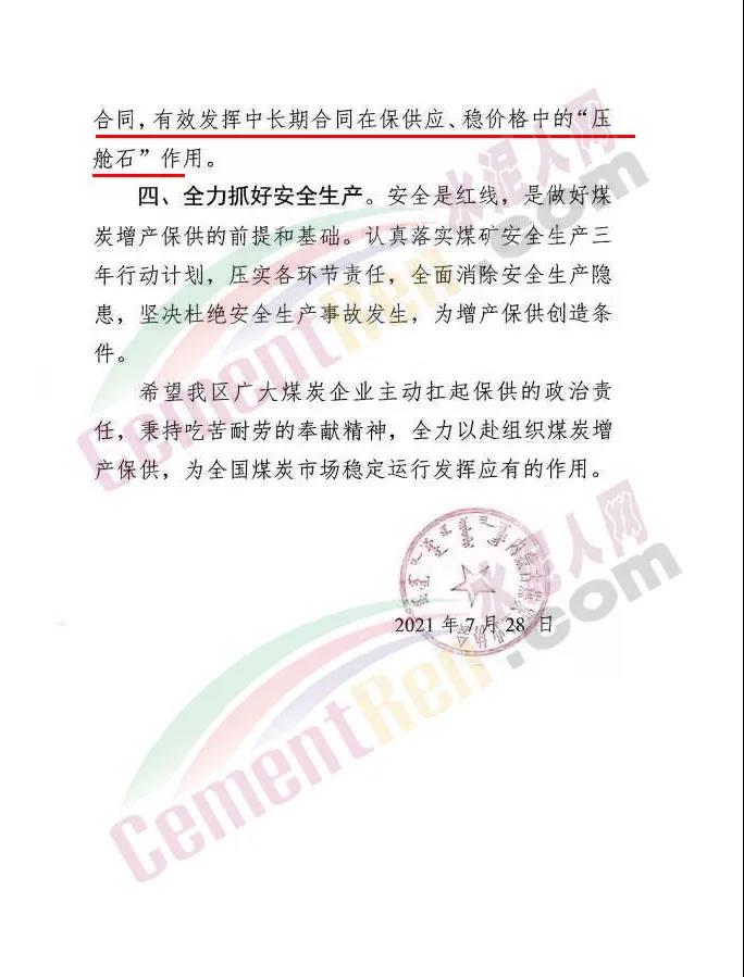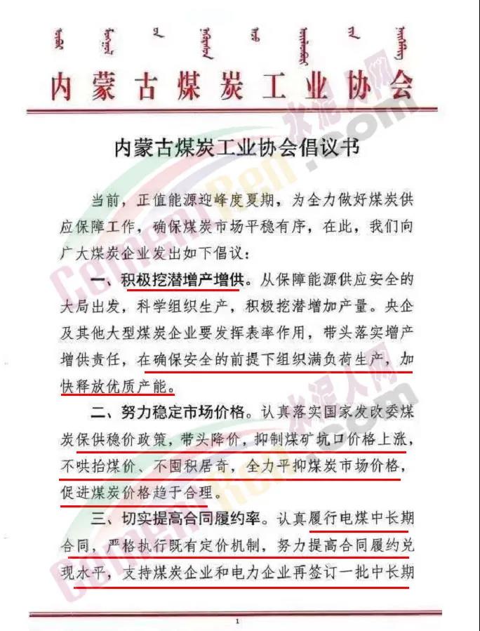 7月28日內(nèi)蒙古煤炭工業(yè)協(xié)會(huì)發(fā)布倡議書(shū)稱(chēng),當(dāng)前,正值能源迎峰度夏期,為全力做好煤炭供應(yīng)保障工作,確保煤炭市場(chǎng)平穩(wěn)有序,向廣大煤炭企業(yè)發(fā)出倡議,積極挖潛增產(chǎn)增供努力穩(wěn)定市場(chǎng)價(jià)格。帶頭降價(jià),抑制煤礦坑口價(jià)格上漲,不哄抬煤價(jià)、不囤積居奇,全力平抑煤炭市場(chǎng)價(jià)格。促進(jìn)煤炭?jī)r(jià)格趨于合理。切實(shí)提高合同履約率。認(rèn)真履行電煤中長(zhǎng)期合同。嚴(yán)格執(zhí)行既有定價(jià)機(jī)制。努力提高合同履約兌現(xiàn)水平,支持煤炭企業(yè)和電力企業(yè)再簽訂一批中長(zhǎng)期合同,有效發(fā)揮中長(zhǎng)期合同在保供應(yīng)、穩(wěn)價(jià)格中的“壓艙石”作用。