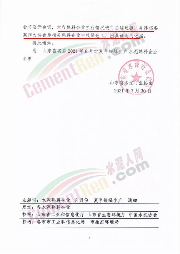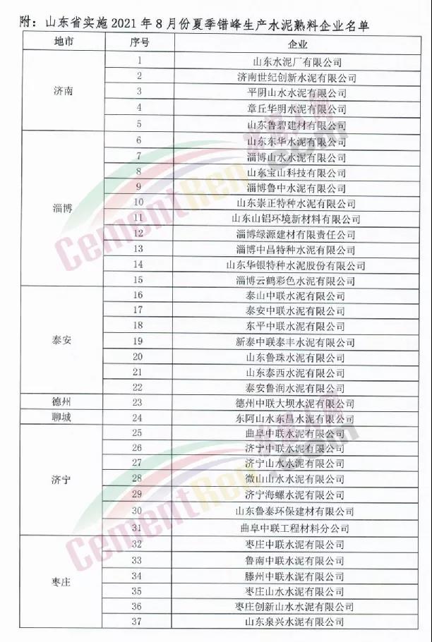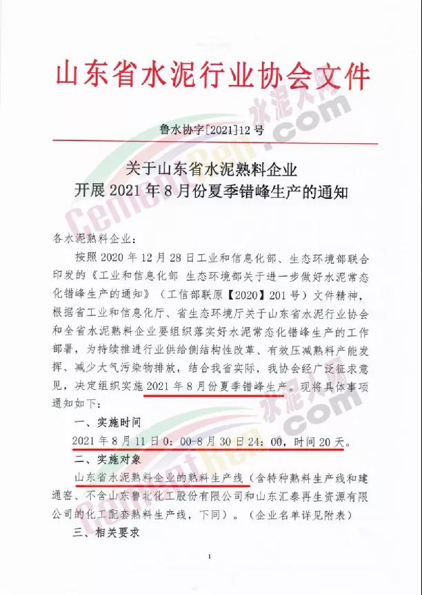 7月30日山東省水泥行業(yè)協(xié)會(huì)發(fā)布《關(guān)于山東省水泥熟料企業(yè)開展2021年8月份夏季錯(cuò)峰生產(chǎn)的通知》稱按照相關(guān)文件要求將組織山東省水泥熟料企業(yè)的熟料生產(chǎn)線實(shí)施2021年8月份夏季錯(cuò)峰生產(chǎn)。